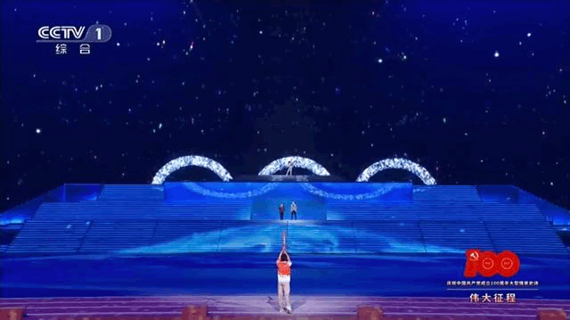 蔡灿煌:焰火第一次出现是在第2分13秒,配合演出《盛典》篇章,舞台中千名演员组成党徽造型,高空特效焰火打出“100”字样,拉开焰火表演的帷幕。