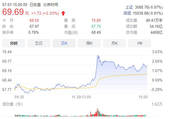 (健康时报记者李超然)截至7月1日收盘,恒瑞医药收报69.69元/股,总市值为4458.1亿元,股价与今年1月8日高点(97.23元/股)相比,下跌幅度近30%,总市值在半年内蒸发了约1800亿元。