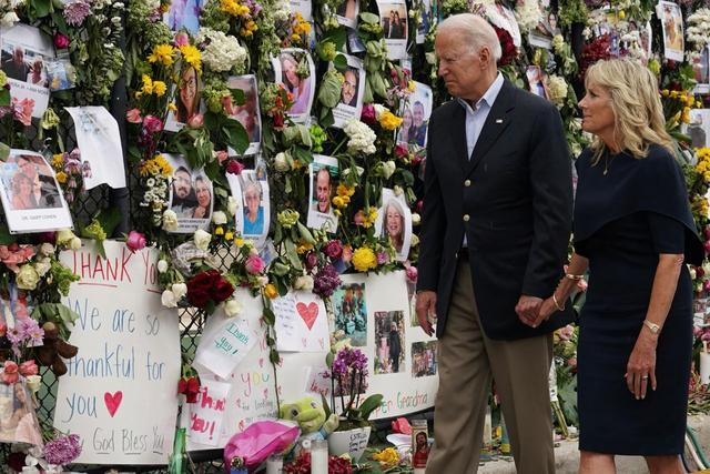当地时间7月1日,美国总统拜登夫妇前往佛罗里达州公寓坍塌事故现场,悼念遇难者。/IC photo