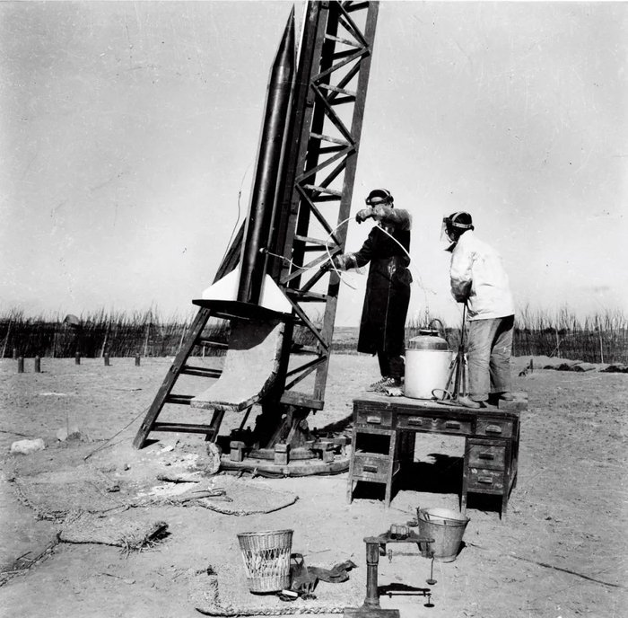 1960年,科研人员利用打气筒为中国首枚自行研制的液体燃料探空火箭加压。