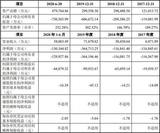 2017年、2018年、2019年、2020年上半年营业收入分别为0.69亿元、3亿元、7亿元、3.8亿元;净利润分别为-11.68亿元、-11.68亿元、-36.47亿元、-13亿元。