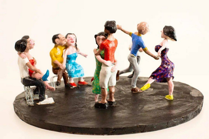 张大静×周沛勇×方奋筹,《曲终人散》,免漆板木盒,油泥雕塑群像(20cm高),电动转盘,黑胶时钟,迪斯科发声灯,绒布,镜子,声音,2021年(雕塑部分)