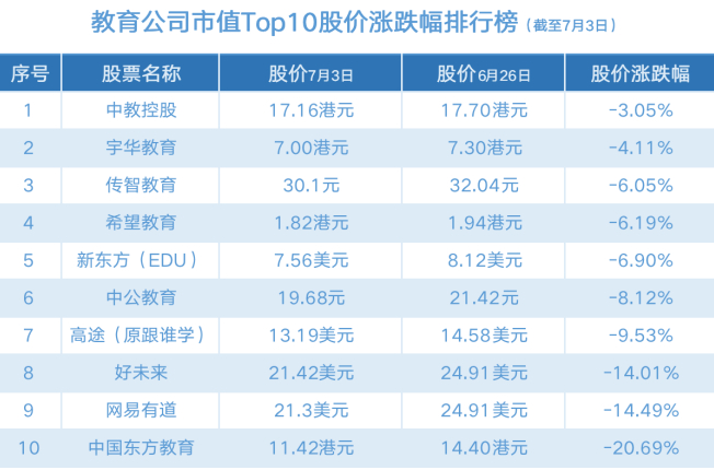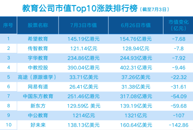 本周(6月26日-7月3日),教育概念股TOP10中,10家公司全部下滑。具体看,好未来(TAL)领跌,股价下滑14.01%市值蒸发142.86亿元,成为市值缩水最多的公司,希望教育(01765.HK)则下滑7.68亿元成为市值减少最少的公司;股价方面,港股教育公司中国东方教育(00667.HK)以20.69%成为下滑最多的公司,中教控股(00839.KH)则最抗跌,股价下滑仅3.05%。