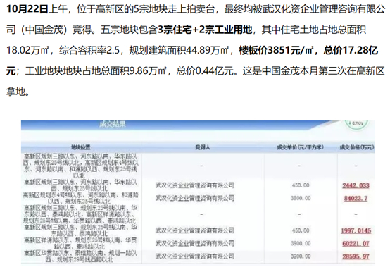 10月22日,金茂拿了最后一批土地,确切的说当时不是金茂拿的,而是中化下属公司武汉化资拿的,住宅楼面价还是3800-3900元/平米,商办450元/平米。这就是中化对于金茂的支持,宁高宁把华润的“母体孵化”模式复制了过来,几个月后,中化把武汉化资和其他一些项目打包卖回给了金茂。