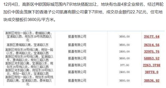 2017年12月4日,金茂再摘7块地,有住宅的楼面价在2400元/平米和3600元/平米,商办用地的楼面价是377元/平米。