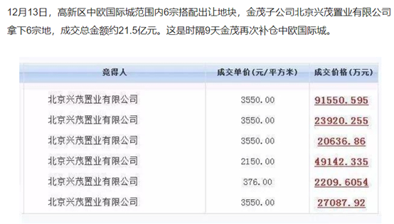12月13日,金茂再拿6块土地,价格也和9天之前的差不多。