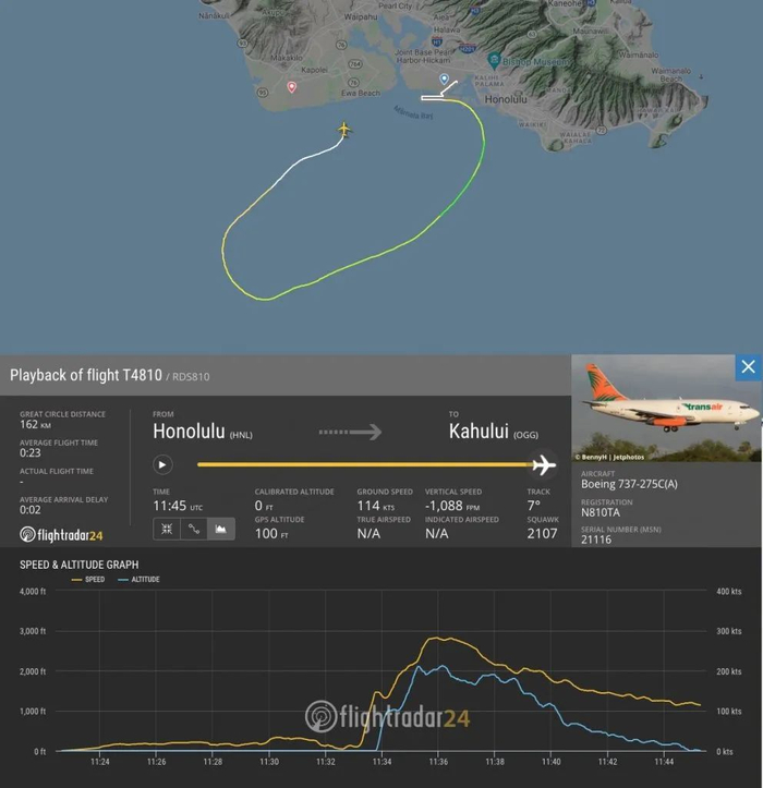 根据飞行追踪平台FlightRadar24的说法,这架隶属于Transair公司的航班当时正飞往卡胡鲁伊(Kahului)。飞机于当地时间凌晨1点33分从檀香山起飞,爬升至约2,100英尺(640米),然后盘旋返回并下降到瓦胡岛海岸附近的海中。