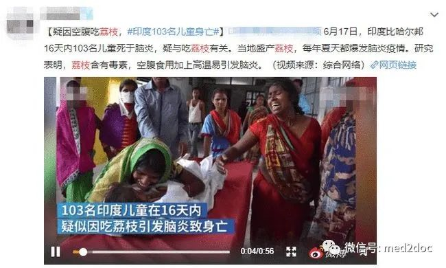 此前有新闻报道,印度比哈尔邦16天内有103名儿童死于脑炎,疑与吃荔枝有关。当地盛产荔枝,每年夏天都有爆发脑炎疫情。研究表明,荔枝含有毒素,空腹食用加上高温易引发脑炎。