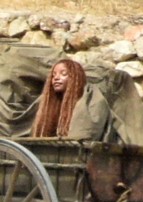 这组片场照所展现的,是小美人鱼第一次上岸,进入人类社会时的情景。照片中饰演小美人鱼的哈莉·贝利,藏匿在一辆人类的马车中,身上盖着一层粗布,只有脑袋和头发暴露在外,似乎是在观察着陌生的人类世界,在原版动画电影中,也有相应的镜头表现过这段剧情。
