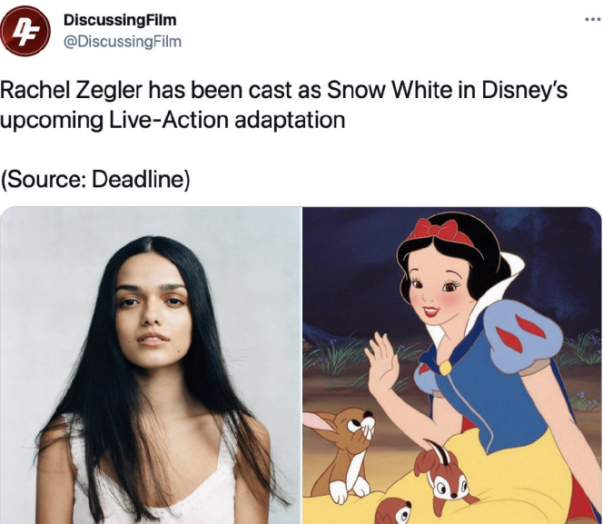 而几乎就在《小美人鱼》真人电影曝出片场照片的同一时期,迪士尼也终于敲定了真人电影《白雪公主与七个小矮人》中,白雪公主的演员人选——曾主演过《西区故事》的拉丁裔女演员瑞秋·齐格勒。