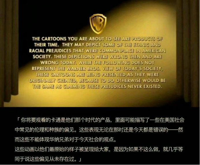 而类似的说明内容,同样也出现在了诸多华纳经典的动画作品中,例如曾是无数观众童年回忆的《猫和老鼠》,这些作品曾经因为出现了部分涉嫌种族歧视和种族刻板印象的镜头,而遭到不少观众的抵制。