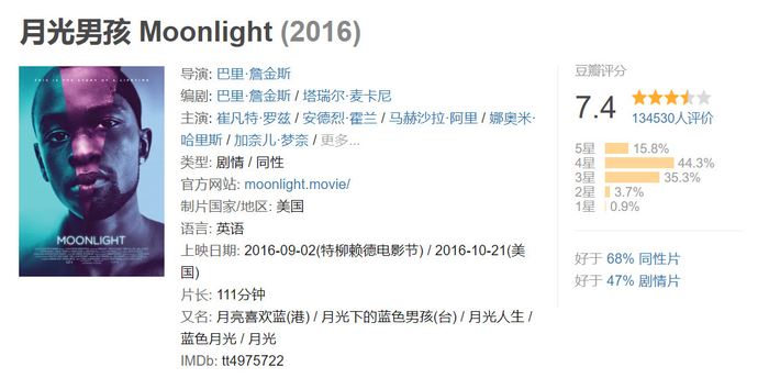 这部电影在“关照”了黑人群体的同时,也没有忘记另一个如今在欧美舆论环境下愈发受到重视的特殊群体——LGBT。电影主角兼顾黑人加LGBT的双重BUFF,可谓是博足了眼球,把能碰的欧美舆论敏感词,都碰了个遍,最终为这部电影博得了当年八项奥斯卡提名,捧回了三座奥斯卡小金人雕像。但本片无论是在国外的IMDB,还是国内的豆瓣平台上,获得的评价,都低于当时有望得奖的另一部热门影片《爱乐之城》,所以称其因为“政治正确”而受到特殊照顾,也是情有可原的。