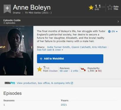 影响最为恶劣的例子,恐怕就是前不久,英国电视台刚播出的根据真实历史改编的剧集《安妮·博林》了。这位历史上最为知名的英国王后,女王伊丽莎白一世的生母,在这一版的剧集中,被强行换肤成了黑人,由黑人演员朱迪·特纳-史密斯饰演。最终本剧在IMDB上,斩获了1.1的超低分,成为IMDB有史以来评分最低的剧集。