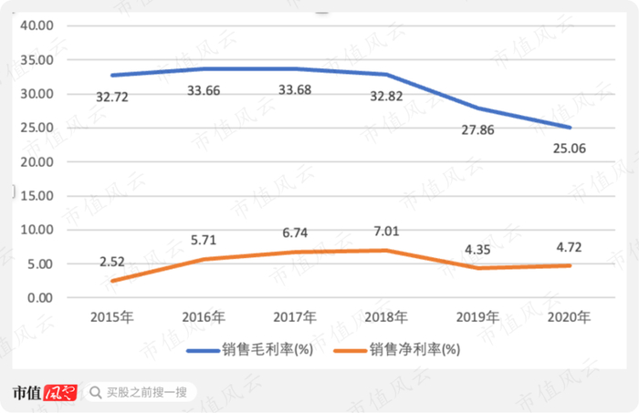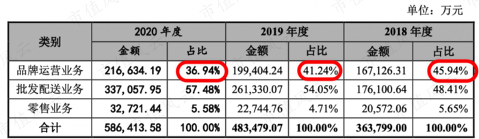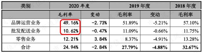 主要原因是品牌运营业务毛利率远比批发配送业务毛利率高,以2020年为例,品牌业务毛利率为49.16%,批发配送业务毛利率为10.62%。