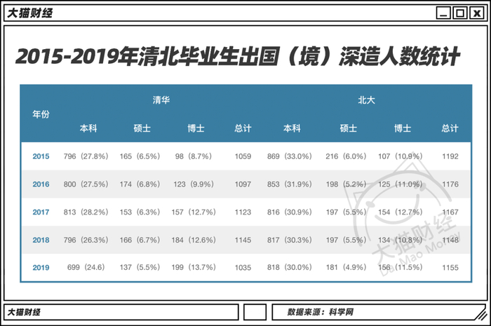 从2015年到2019年,清华约有27%的本科毕业生、6%的硕士毕业生、11%的博士毕业生选择出国深造;而北大则有约31%的本科毕业生、5%的硕士毕业生、11%的博士毕业生选择出国深造。