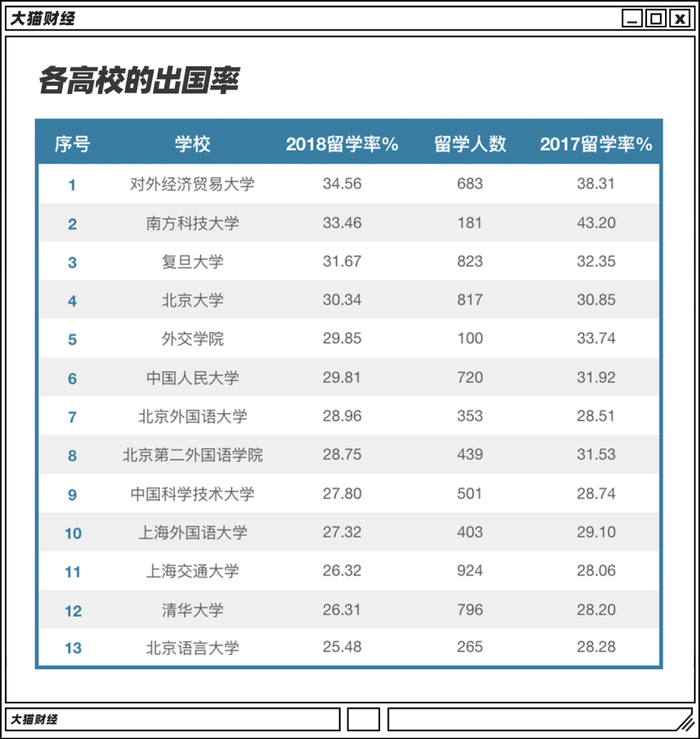 如果把统计范围再放宽点,那数据更是触目惊心。曾经有留学机构统计了下各高校的出国率,发现清华和北大根本就排不到前三——