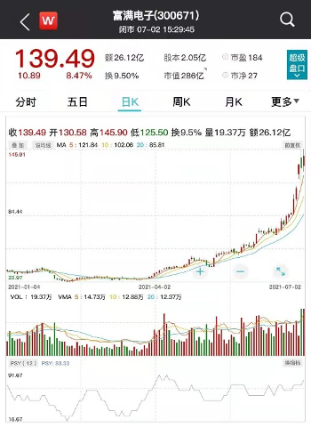 公司基本面大幅改善,股价也随之一路高歌猛进。剔除年内上市新股,富满电子以131.96%的月涨幅高居6月涨幅榜榜首,并领先第二名鼎胜新材(107.69%)足足20%。更值得一提的是,富满电子年初至今累计涨幅高达318.57%,去年年初至今股价涨幅更是达到令人瞠目结舌的721.27%。