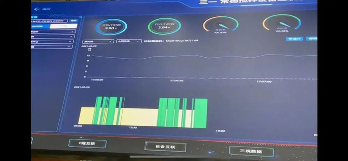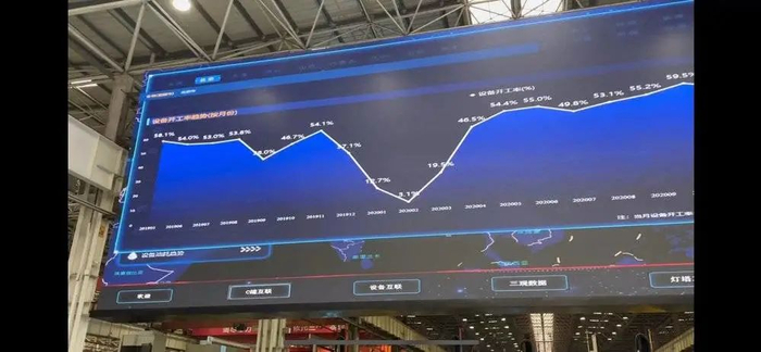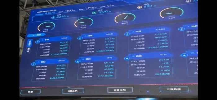 从看到的现场情况来看,车间内不同设备的联网情况已经达到了一个很高的水平:超大的电子屏幕上能够显示出每个生产工艺节点上每台机器的基础运行情况——开机时长、作业时长、总耗电量等维度。假如出现“待机”或“离线情况”,屏幕都会通过不同的颜色警示操作员。