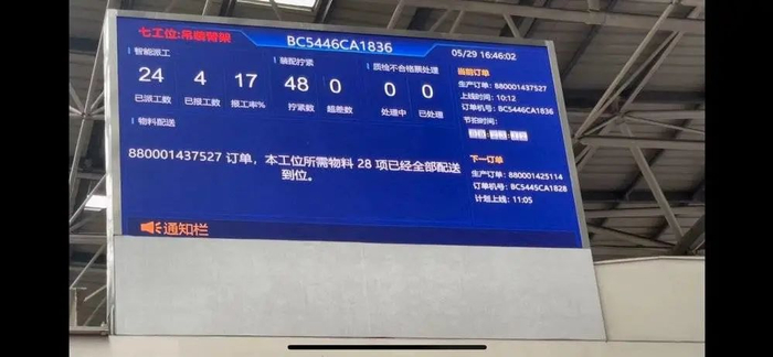在每一个严密对齐的泵车装配工位上,上空都悬着一个“方形屏幕”——每一订单的物料配送情况、派工数、报工率,都清晰地记录在案并予以公示。