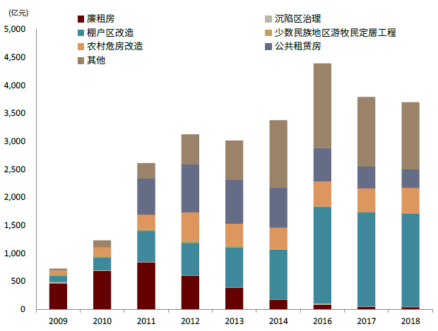 2010年6月,住建部等七部门联合制定《关于加快发展公共租赁住房的指导意见》的发布,旨在发展公共租赁住房,以解决城市中等偏低收入家庭住房困难。公共租赁住房的房源通过新建、改建、收购、在市场上长期租赁住房等方式多渠道筹集,新建公共租赁住房以配建为主。自此,公租房加入了保障房体系,我国保障性住房体系逐步完善。“十二五”规划也明确提出加大保障性安居工程建设,计划每年新建保障性住宅500 万套,力争还清3000 套保障性住房的历史欠账。2014 年,公租房与廉租房并轨为公共租赁住房,消减并停止供应经适房,保障方式由只售不租彻底改革为只租不售。作为我国现行住房保障体系的最重要构成部分,截至2018 年底,公共租赁住房共解决全国3700 多万居民的住房问题。