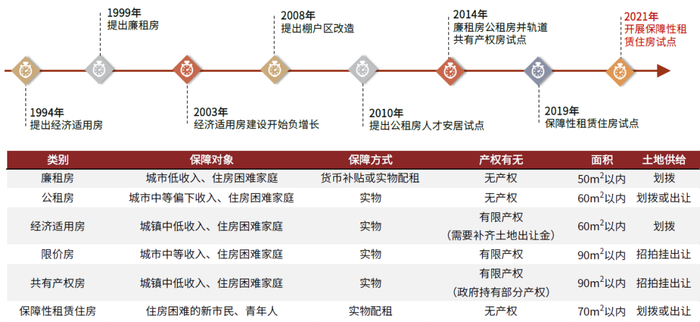 在本次保障性租赁住房的政策出台之前,包括保障性租赁住房在内的住房保障政策也屡次被提及和改革,以解决近些年中国城市化和住房商品化的快速推进导致的住房难、住房贵等民生问题。下面,我们对中国住房保障举措的历史沿革进行梳理。