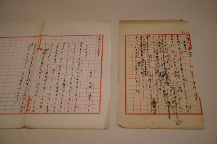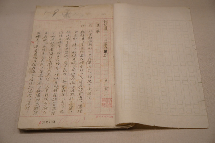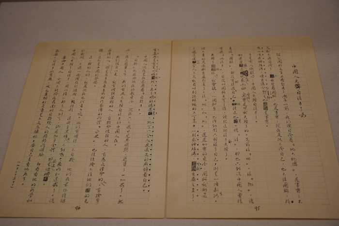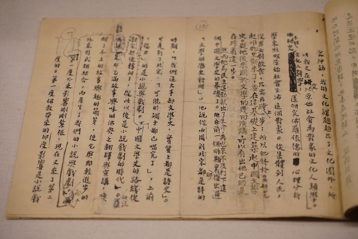 1946年7月15日,闻一多被国民党特务暗杀身亡,同年11月,清华大学成立“整理闻一多先生遗著委员会”,由朱自清领衔,发动清华大学中国文学系同仁搜集、整理、抄写闻一多未刊遗稿,后出版。展览现场中展出一件朱自清手书的序言,其中多处修改,也提及闻一多“终于要研究起唯物史观,要在这个基础上建筑起中国文学史”。