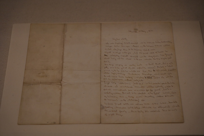 展览中马克思的一件《致燕妮》开始,该信是马克思与小女儿艾琳娜在曼彻斯特恩格斯家中做客时写给女儿燕妮的信。信中,马克思谈到了恩格斯当时正在撰写的著作《爱尔兰史》和弗·阿·朗格的工人问题。