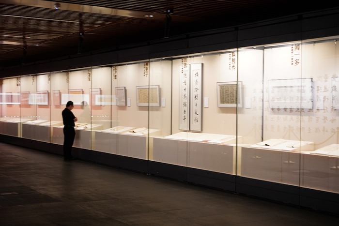 澎湃新闻记者在展览的“光昭九域”篇看到,展厅布置素净通透,展架上陈列的是名家手稿真迹或复制件,附有展牌介绍,墙上则悬挂着当代书法家书写的该名家的其他作品,以形成某种呼应并体现出追慕先贤和新的艺术诠释的意味。