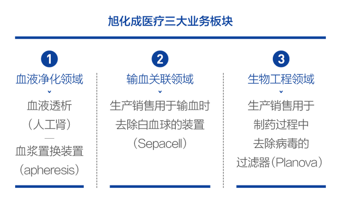 截至目前,旭化成医疗形成了三大业务板块,一是血液净化领域,包括了血液透析(人工肾)和血浆净化(apheresis);二是输血关联领域,生产销售用于输血时去除白血球的装置(Sepacell);三是生物工程领域,生产销售用于制药过程中去除病毒的过滤器(Planova)。