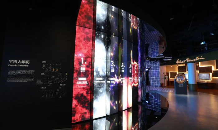 一个巨大的多媒体显示屏,被分割成了12个部分,同时又是一个有机的整体。这里就是宇宙,我们把这个宇宙的138亿年浓缩成1年,你将在屏幕中形象地了解到在这个大宇宙年历的几月几日,我们的宇宙都发生了那些事件,你还将更直观地理解,我们地球上生命的出现是多么的晚,而智慧生命甚至在宇宙年历的最后几个小时才粉墨登场!