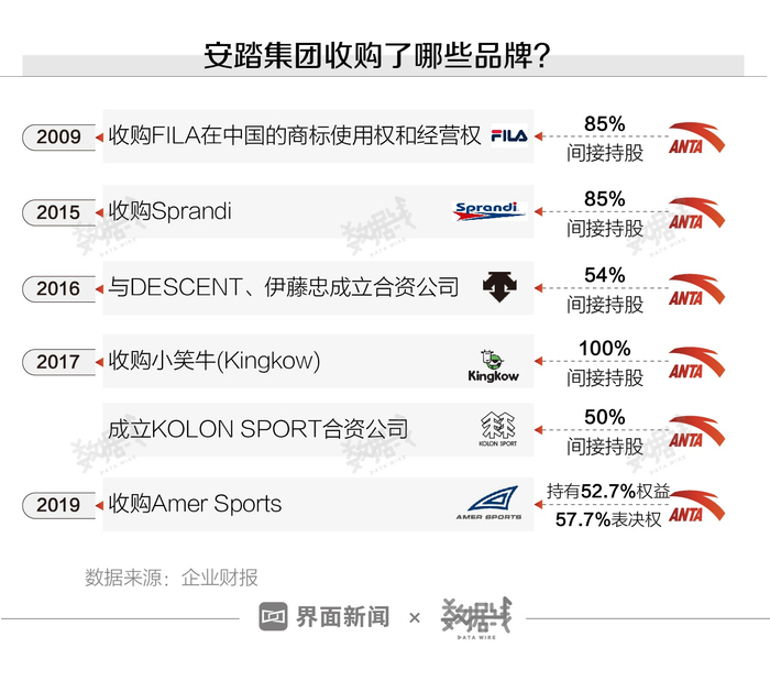 安踏集团的收购战略是业绩大涨的关键。2015年至2019年,安踏集团5年内以收购、成立合资公司等方式将4个运动品牌及体育巨头公司Amer Sports(亚玛芬)纳入旗下。