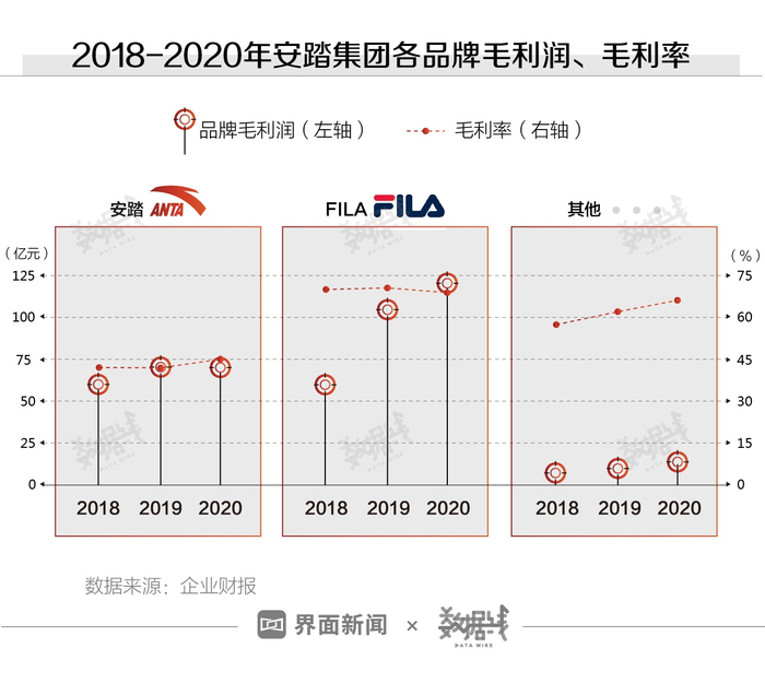 “洋品牌”的盈利能力更强。2020年,安踏的毛利润为70.4亿元,其他品牌的毛利润之和为136.16亿元,比安踏高出近一倍。从毛利率上看,FILA品牌和其他品牌的毛利率均超过60%,比安踏的毛利率(44.7%)高出20多个百分点。
