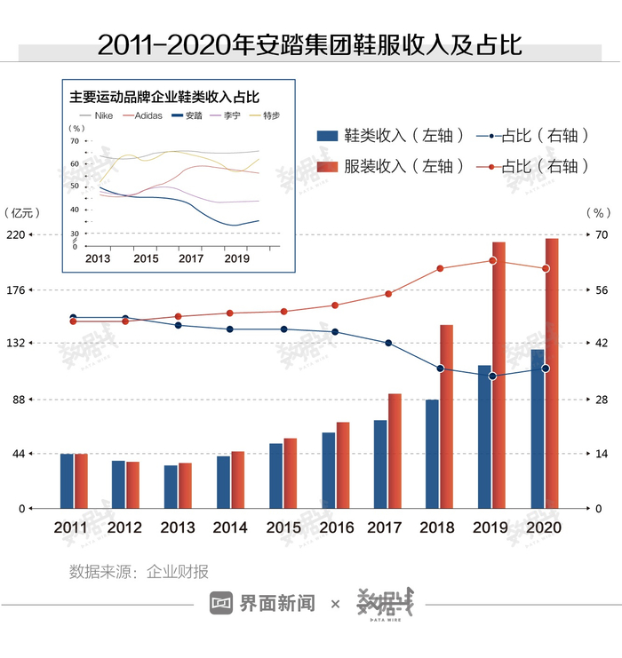 安踏集团发展越来越依赖FILA。FILA衣服卖得多,集团的服装收入也跟着涨。2020年,安踏集团鞋类收入占比35.8%,服装收入占比61%。近9年,安踏集团鞋类收入平均增速为13.7%,服装收入平均增速为121.9%。据华创证券分析,FILA品牌服装收入占比较高、增长强劲,带动了集团服装收入增长。