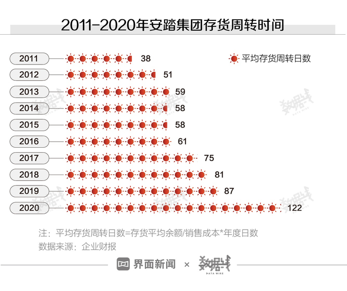 直营模式的另一个问题是存货周转时间(指企业从取得存货开始,至消耗、销售为止所经历的天数)增加。2011年至2020年,安踏集团平均存货周转日数增长2倍多。2020年集团平均存货周转日数比去年同期多了35天。据企业财报,2020年安踏启动DTC模式(直接面对消费者的营销模式)转型,对11个地区约3500家主品牌安踏门店开展混合运营,其中60%由集团直营。