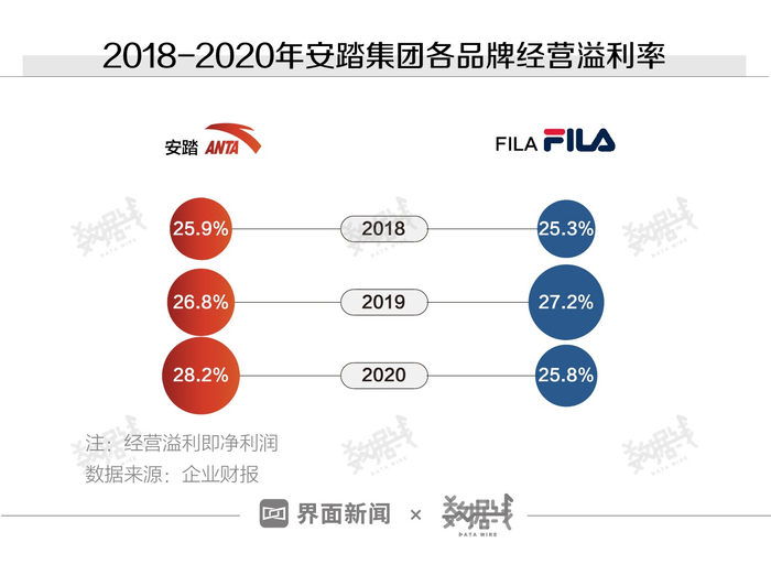只靠FILA赚钱也有风险。虽然FILA品牌的毛利率高于主品牌安踏,但两个品牌的净利润率相差不大。安踏集团对FILA品牌采取直营模式,因此运营费用较高,一定程度上影响了品牌的盈利能力。