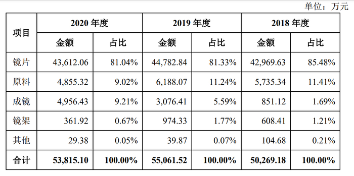 从收入结构看,明月镜片2020年靠卖镜片录得收入4.36亿元,占总营收的81.04%,卖成镜的收入为4956.43万元,占比9.21%,整个2020年的营业收入为5.38亿元。