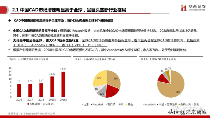 中国CAD市场增速明显高于全球:根未来几年全球CAD市场规模增速预计保持6.5%,2028年将达到138.3亿美元。其中,同期中国CAD市场规模增速明显高于全球。