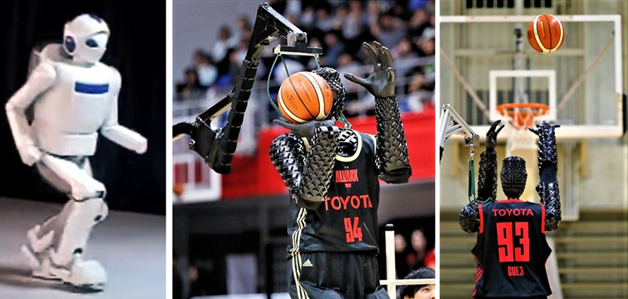 2009年丰田发布了第二代会跑步的机器人,他的跑速可以达到每小时7公里,当然必须在平坦无障碍的路面跑,还有一款叫CUE4的可以投篮球的机器人。