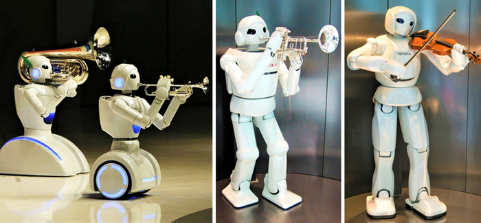 早在2003年丰田发布的第一代仿人类机器人是著名的“丰田音乐伙伴机器人“,从无腿版到有腿版,从吹喇叭的到拉小提琴的机器人,都经过了数年的升级进化。