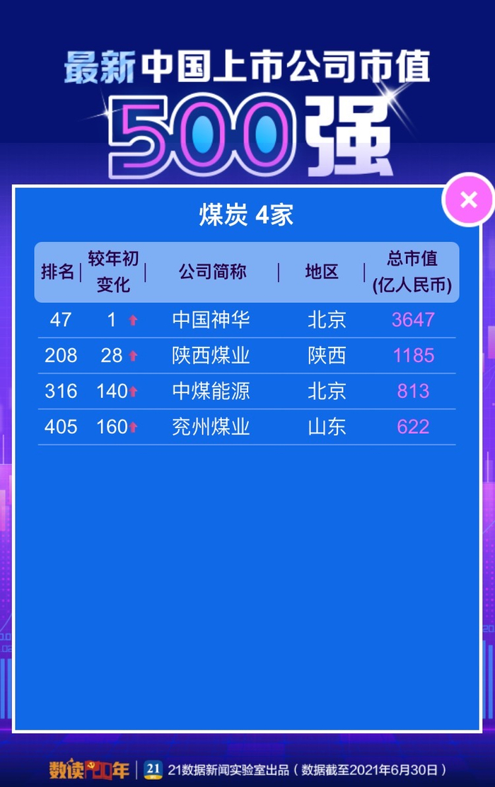 不过,今年由于经济复苏和再通胀预期,叠加碳中和政策下的供给侧结构性改革预期,资源型行业在资本市场再受关注,市值回升明显,500强公司席位新增2家。如兖州煤业(600188.SH)上升160名,重回500强;合盛硅业(603260.SH)更是从年初的695名提至312名。