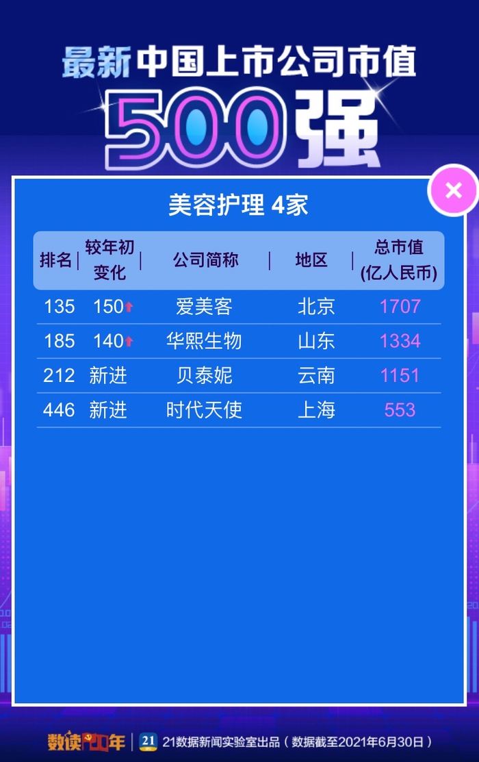 即使在融资降温的2019年和2020年,亦迎来一波颜值经济企业上市潮。2019年底登陆科创板的华熙生物(688363.SH)一上市就开启了500强之路,不足两年市值已翻两番。