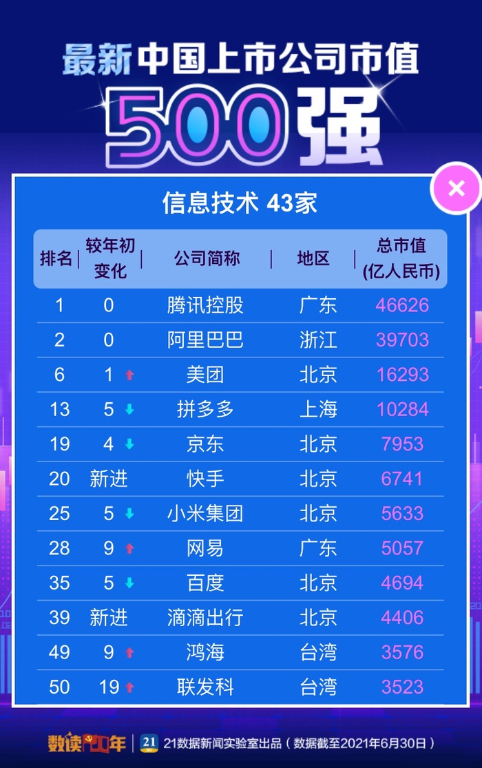 回溯2010年底,信息技术行业仅腾讯、鸿海、百度、联发科4家千亿市值公司。如今千亿市值名单已扩至20家,除了这4家外,不乏阿里巴巴、美团、拼多多、京东、快手、小米、网易等大家耳熟能详的明星公司。