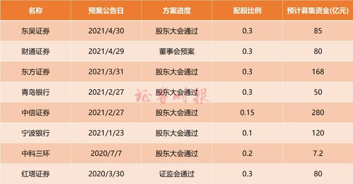 今年来,配股融资数量和金额都相对较少,但接下来将有多笔配股“大军”在路上,其中,中信证券280亿元的配股融资方案刚获股东大会通过,东方证券、宁波银行预计配股融资金额过百亿。