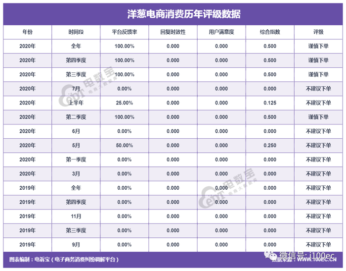 近年来洋葱集团在不断发展的过程中,也存在不少质疑和投诉。据国内知名网络消费纠纷调解平台“电诉宝”(315.100EC.CN)数据显示,洋葱从2019年至2020年的各个季度及年度消费评级中,均被获得“不建议下单”或“谨慎下单”评级。投诉频频,问题集中在售后服务、货不对板等方面上。