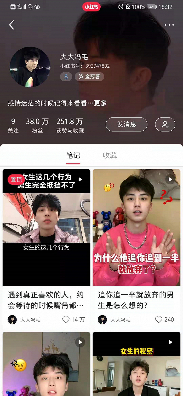 在小红书拥有38.0万粉丝的博主@大大冯毛 在微博上大多是以网红照片为主要内容,但在小红书上却化身你的爱情咨询顾问,个人简介标明“感情迷茫的时候记得来看……”