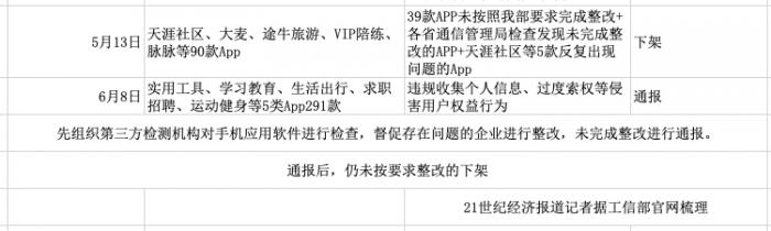 今年5月13日,工信部通报称,在近期检测中,发现天涯社区、大麦、途牛旅游、VIP陪练、脉脉五家企业在APP不同版本中反复出现同类问题,包括违规收集个人信息等;工信部将依法暂停其违规行为,予以直接下架处理。