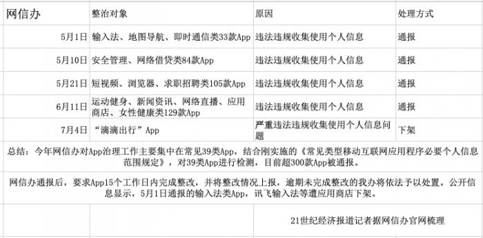 今年网信办先后检测了4批常见类型、公众大量使用App的个人信息收集使用情况,超过300款App被发现存在“违反必要原则,收集与其提供的服务无关的个人信息”“未经用户同意收集个人信息”等问题。网信办通报后,要求App15个工作日内完成整改,并将整改情况上报,逾期未完成整改的将依法予以处置。