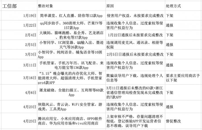 2019年1月,中央网信办、工业和信息化部、公安部、市场监管总局四部门联合发布《关于开展APP违法违规收集使用个人信息专项治理的公告》,在全国范围组织开展APP违法违规收集使用个人信息专项治理,并成立APP违法违规收集使用个人信息专项治理工作组。