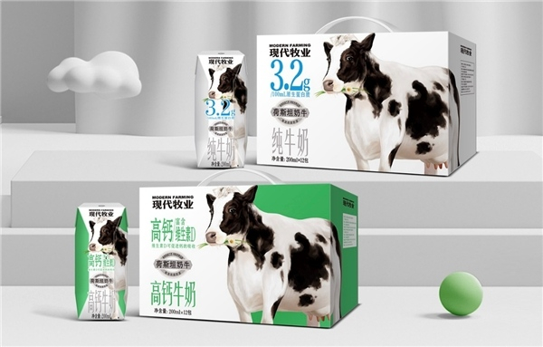 为了让消费者能直观分辨出好奶,现代牧业还直接将“荷斯坦”好牛形象直接作为包装主视觉设计,搬上了产品包装“封面”。加上了显眼的“牛照”,省去了在商超货架仔细研究对比的时间,让人一眼就能在茫茫“奶海”中选出源自好牛的好奶。