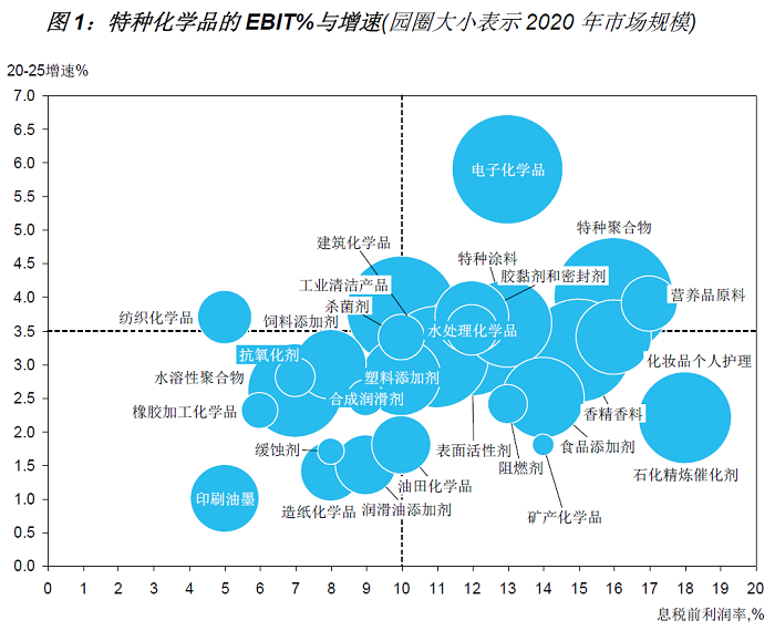 特种化学品行业现在正试图通过提高价格来弥补更高的研发成本以及原材料成本来提高利润率。这种趋势在粘合剂和密封剂、油漆、塑料添加剂、纸张和水处理化学品、表面活性剂和润滑剂方面会较为明显,食品添加剂、香精香料和电子化学品的原料成本占比较小,定价压力不大。